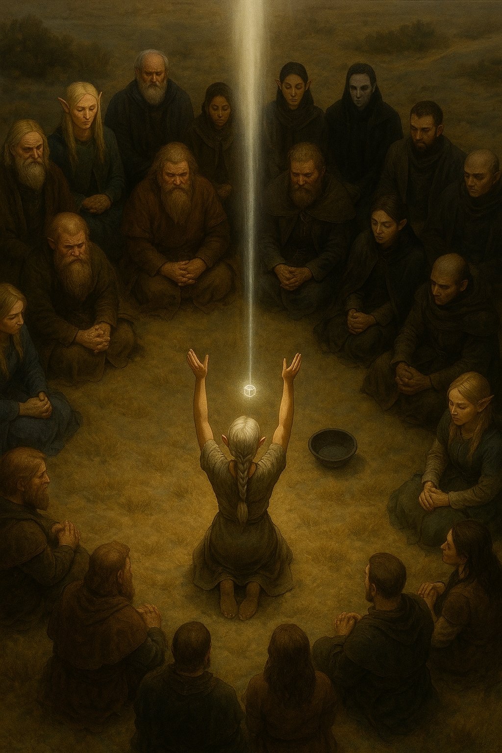 Au centre du cercle, la prêtresse elfe Ystenia des Étoiles, drapée d’un manteau blanc immaculé, s’avança en portant un coussin de soie. Sur ce coussin reposait un objet… ordinaire. Un simple dé de pierre, rugueux, taillé grossièrement.