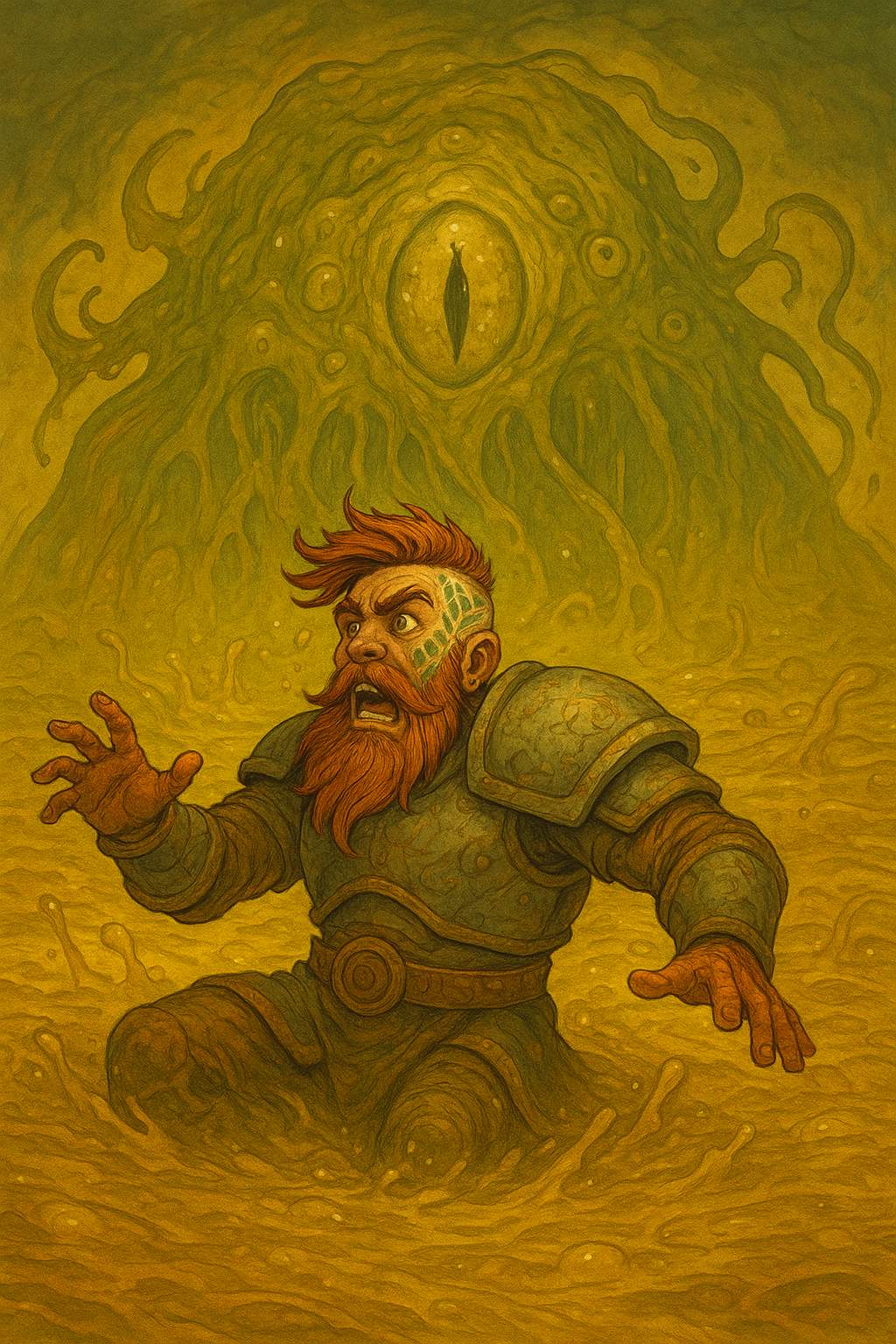 « Aaaaargh ! Où je suis ?! Par les barbes de mes ancêtres ! Pourquoi que ça colle autant, c'est de la mélasse ?! Pourquoi ce sol palpite, beurk, pouah, dégueulasse ?! »